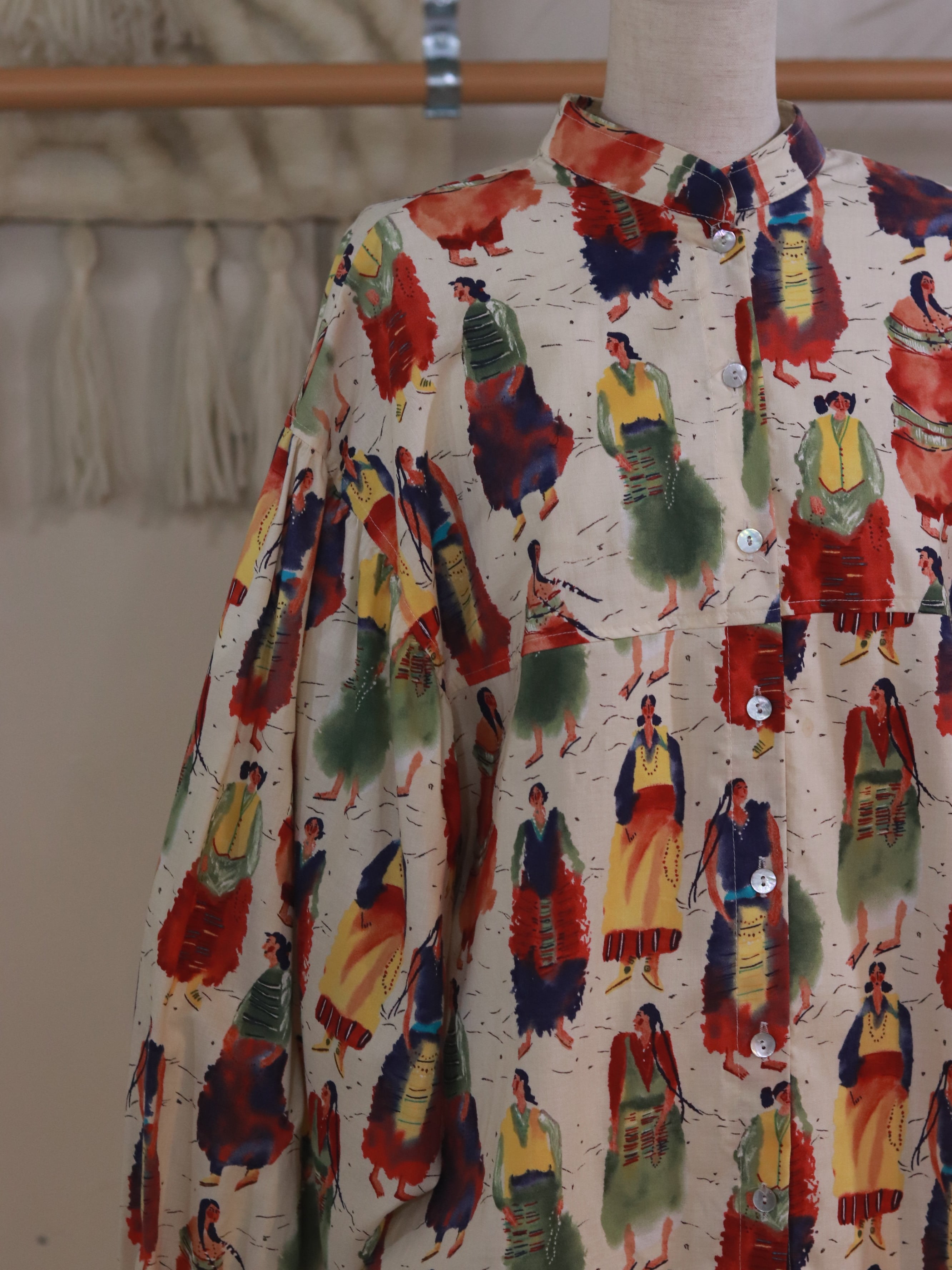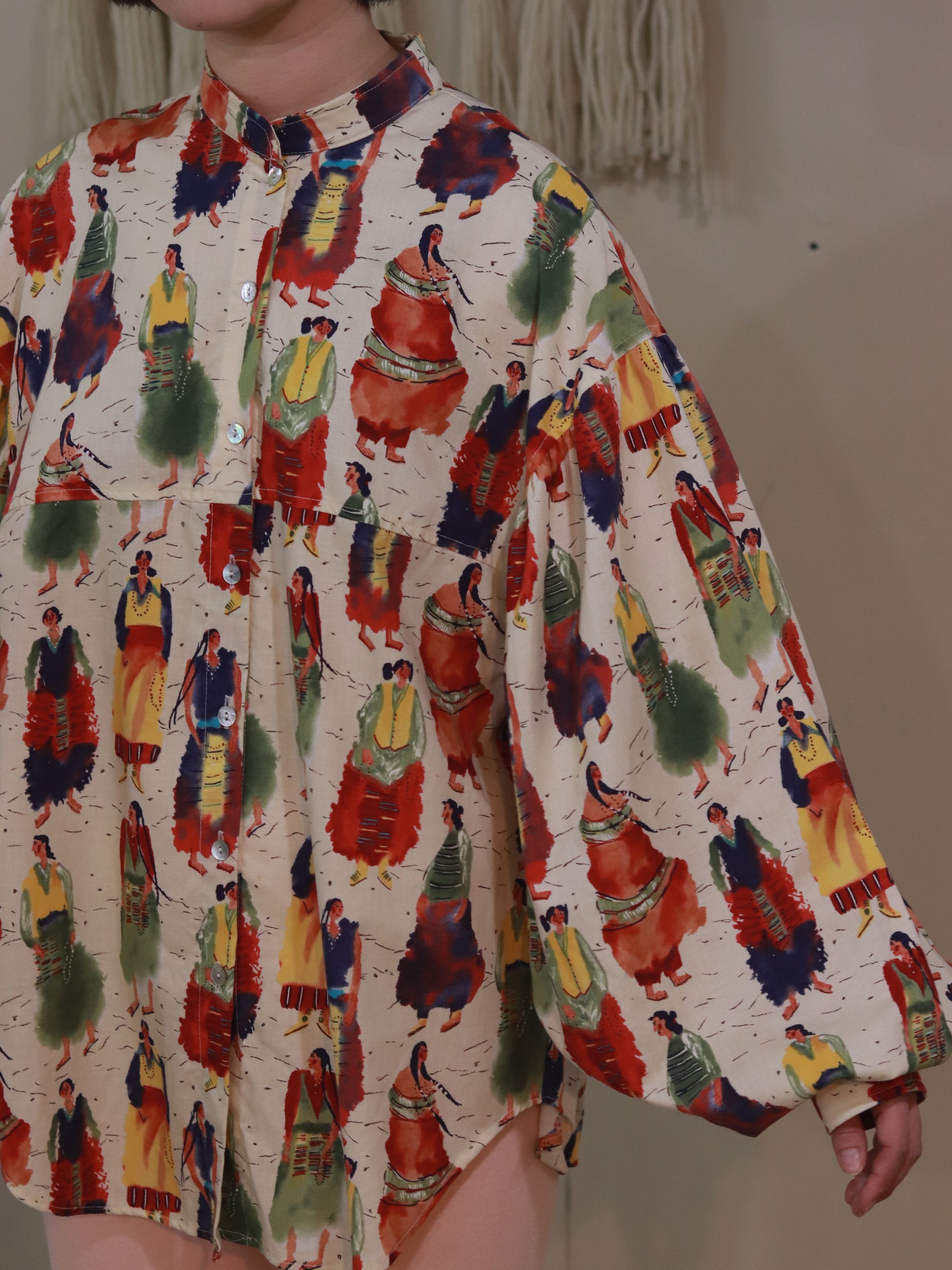 たっぷりとしたスリーブに民族女性の総柄が素敵です。